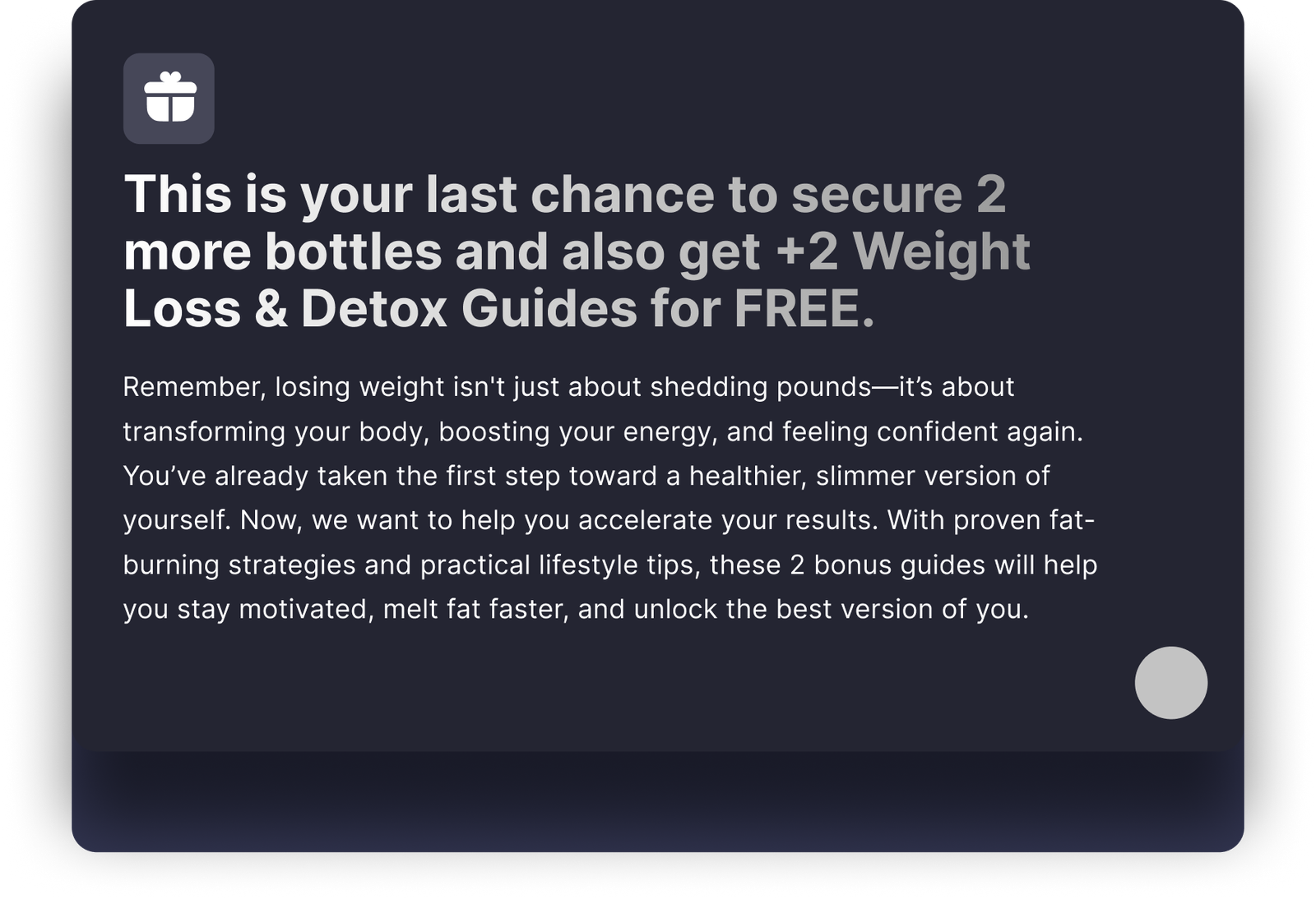You just won 2 bottles for $35 each A savings of $70 Dollars Extra Bonus: 2 Weight Loss Guides for FREE